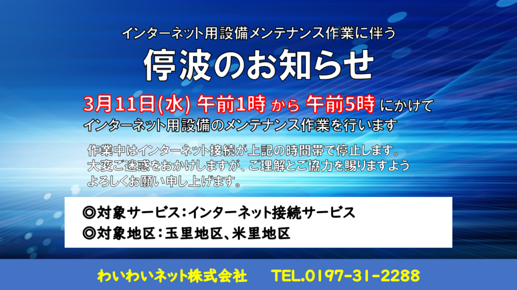奥州市光ネット設備交換作業に伴う停波のお知らせ(玉里地区、米里地区)
